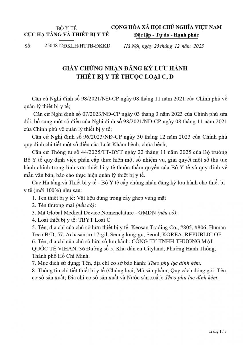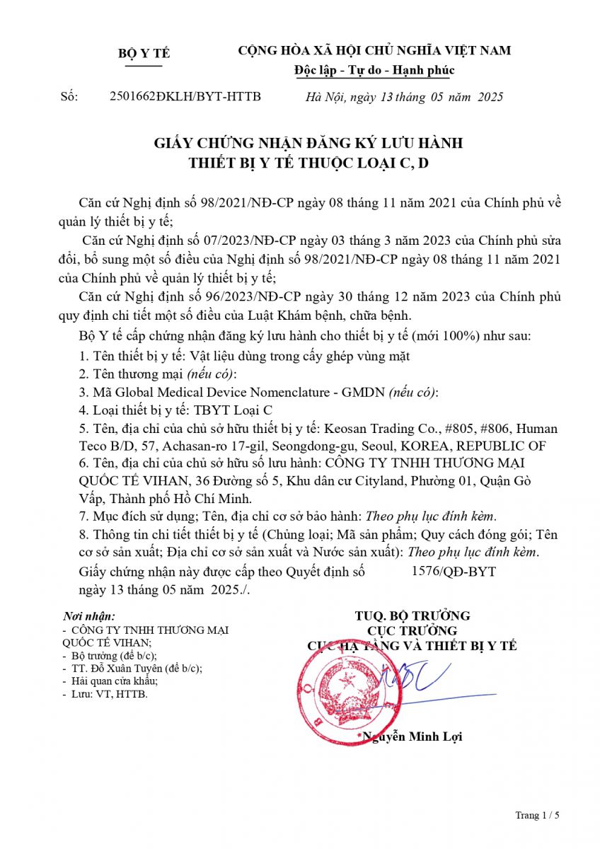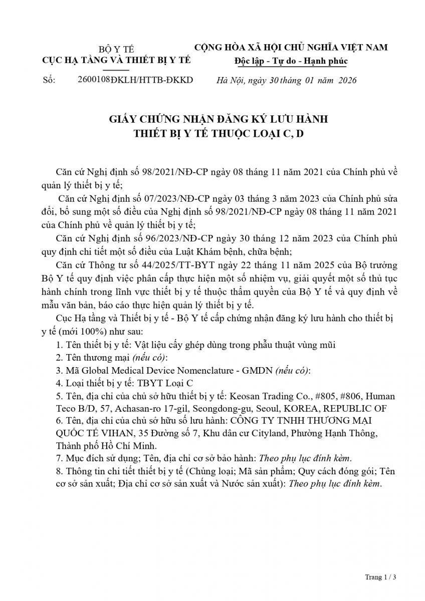 Sau một chặng đường dài nỗ lực không ngừng và kiên trì theo đuổi các tiêu chuẩn khắt khe, toàn bộ danh mục vật liệu cấy ghép dùng trong phẫu thuật nâng mũi đã chính thức được Bộ Y tế Việt Nam cấp Giấy phép lưu hành Trang thiết bị Y tế loại C, bao gồm 04 giấy phép: