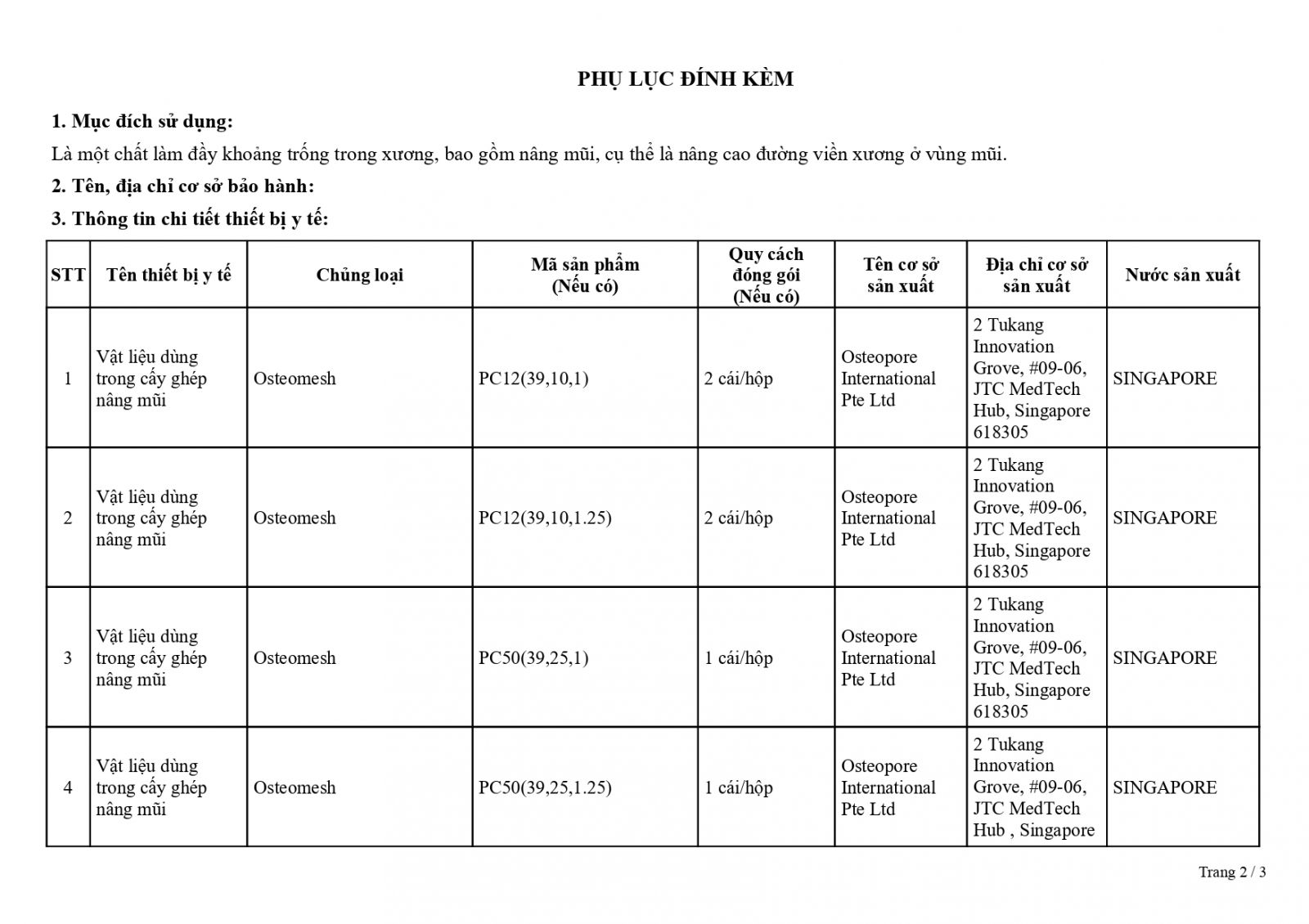 • Số: 2403851/ĐKLH – Vật liệu cấy ghép nâng mũi Osteopore
