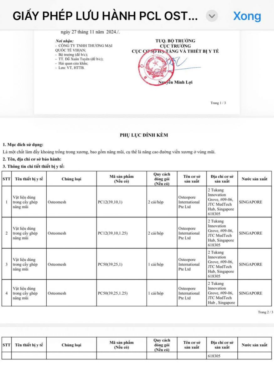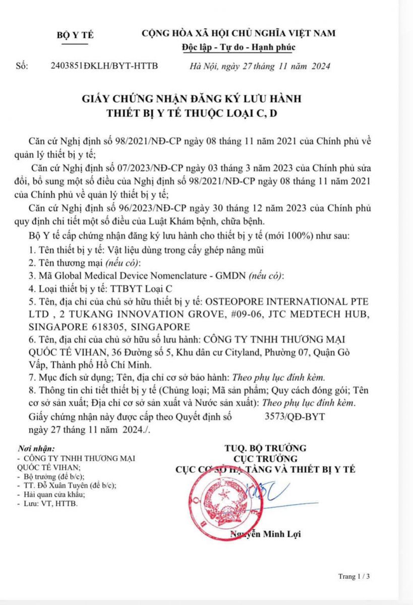 • Số: 2403851/ĐKLH – Vật liệu cấy ghép nâng mũi Osteopore