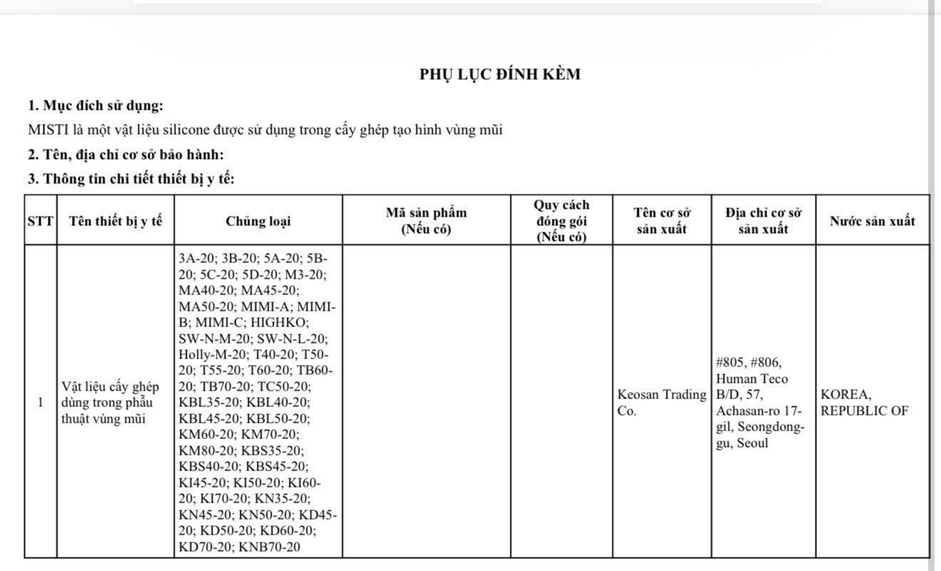 Sau một chặng đường dài nỗ lực không ngừng và kiên trì theo đuổi các tiêu chuẩn khắt khe, toàn bộ danh mục vật liệu cấy ghép dùng trong phẫu thuật nâng mũi đã chính thức được Bộ Y tế Việt Nam cấp Giấy phép lưu hành Trang thiết bị Y tế loại C, bao gồm 04 giấy phép: